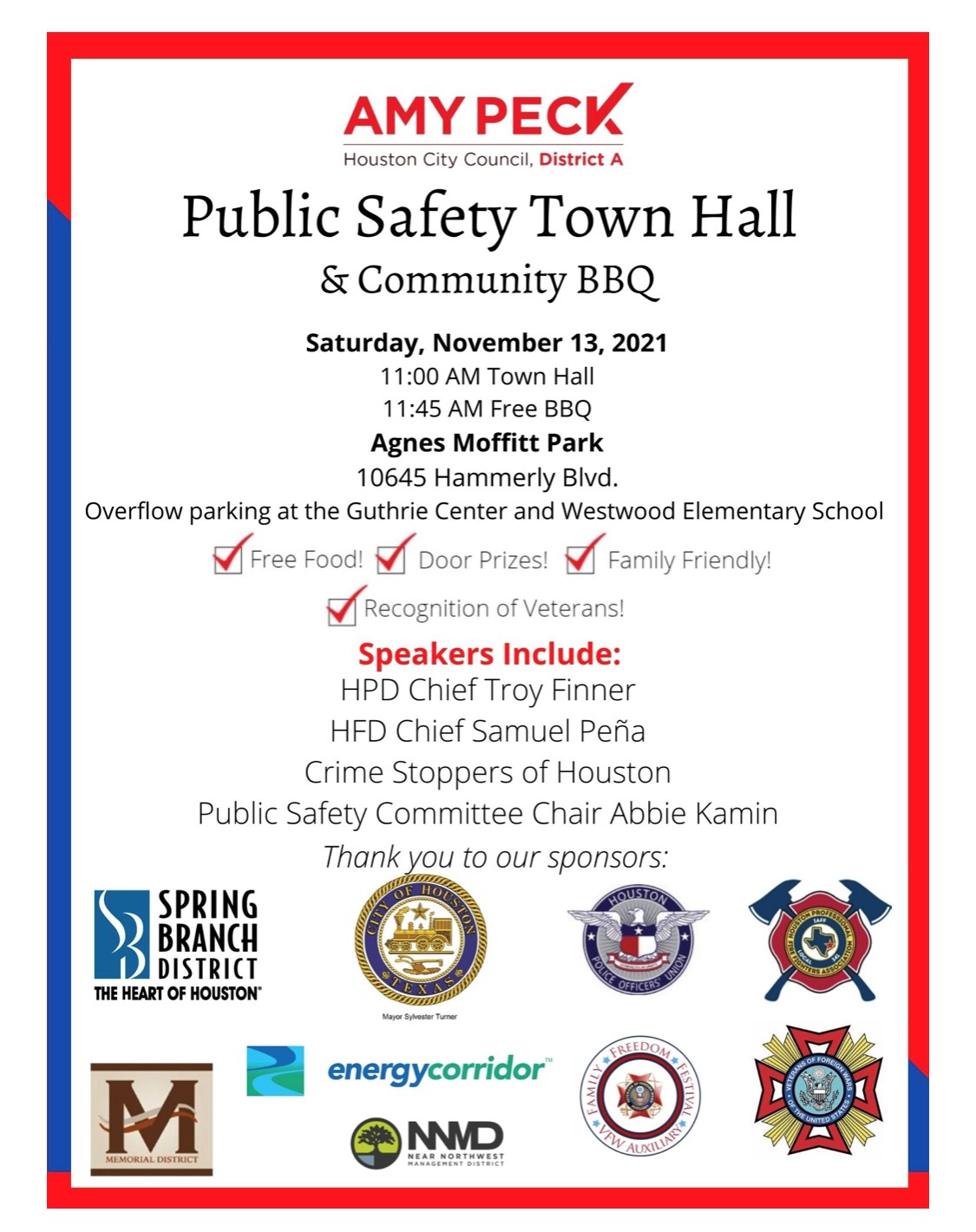 Attend the Public Safety Town Hall and Community BBQ on Saturday, November 13, 2021 at 11:00 AM. The event will take place at Agnes Moffitt Park at 10645 Hammerly Blvd., and overflow parking will be available at the Guthrie Center.