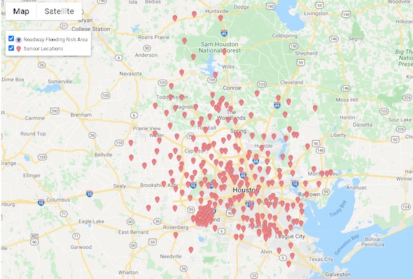 In 2019, the app showed 76 sensors. Today, it gets real-time data from almost 300 weather sensors that alert travelers to roadway flooding risks in Harris, Fort Bend, Waller, Brazoria, and Galveston counties.