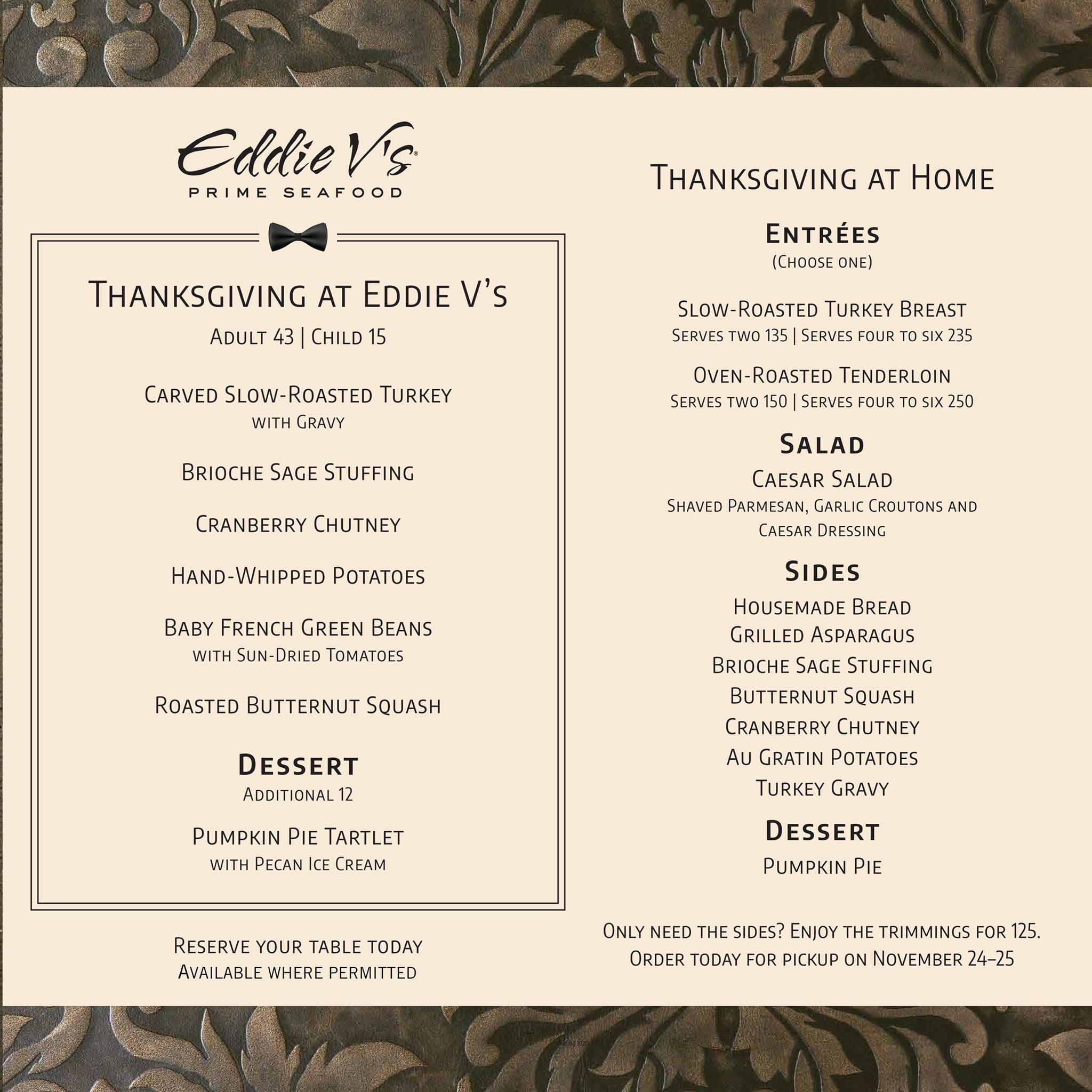 Capital Grille offers a full Thanksgiving dinner menu and a full dinner to go. The dine in-menu is $43 person and the to-go option starts at $125. If you choose to dine in, please make reservations ahead of time.