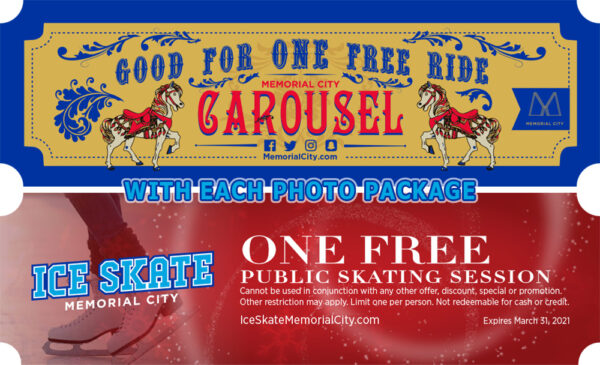 At St. Nick’s Park, choose one of multiple photography session options. Make a reservation before December 16 to receive $3 off your photo package. Then, with each photo package that you purchase at St. Nick’s Park, receive free passes to Ice Skate Memorial City and the Memorial City Carousel.