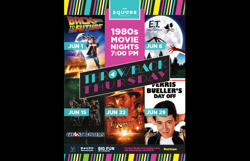 The Square at Memorial CIty is taking it back to the 80s all in June with classics like ET, Ferris Bueller’s Day Off, Ghostbusters, and Back to the Future and more. Complimentary popcorn will be served and blankets and lawn chairs are encouraged.