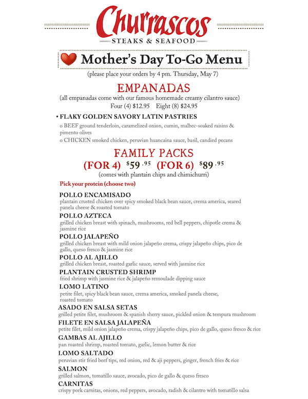 Mom’s favorite cuisines are in the Memorial District. Our restaurants can help you make a Mother’s Day meal. Churrascos, for example, can bring the flavor of South America to your dining room. Get a Mother’s Day family pack to serve up to 6 people.