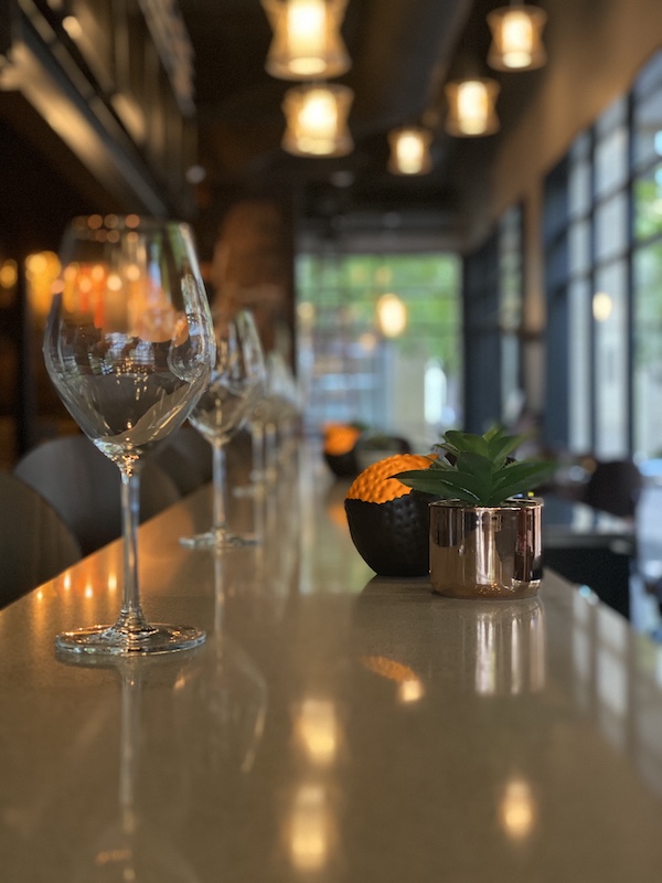 The restaurant encompasses a 3,500-square-foot space on Sorella Court, and the main dining room seats 60 people. Additionally, the patio seats 28, the private dining area on the mezzanine level seats 24, and the chef’s table seats 8. The roomy seating and outdoor space are helpful for socially distanced meals.